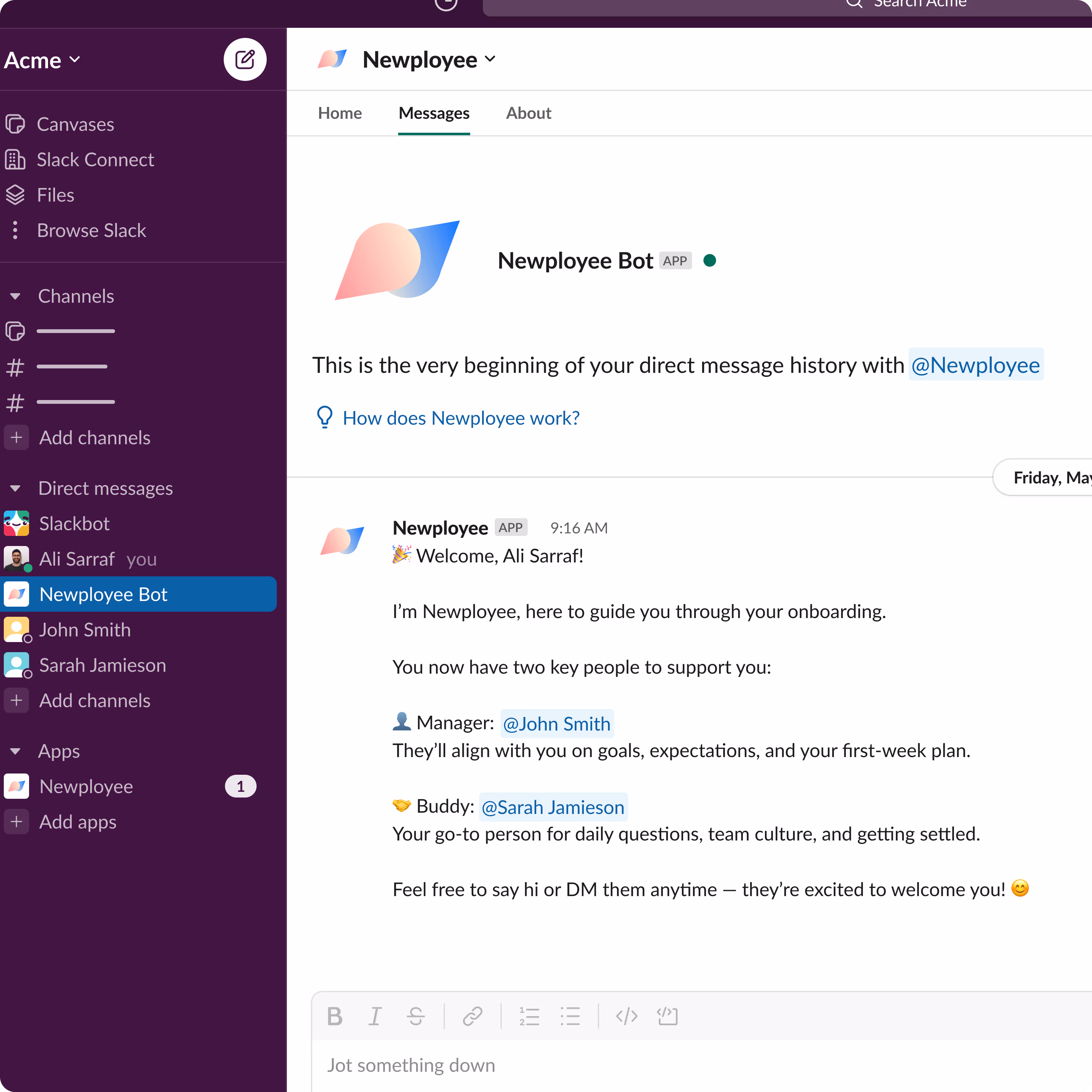 Introduce managers and buddies automatically with scheduled Slack messages so every new hire knows exactly who to turn to from day one.
